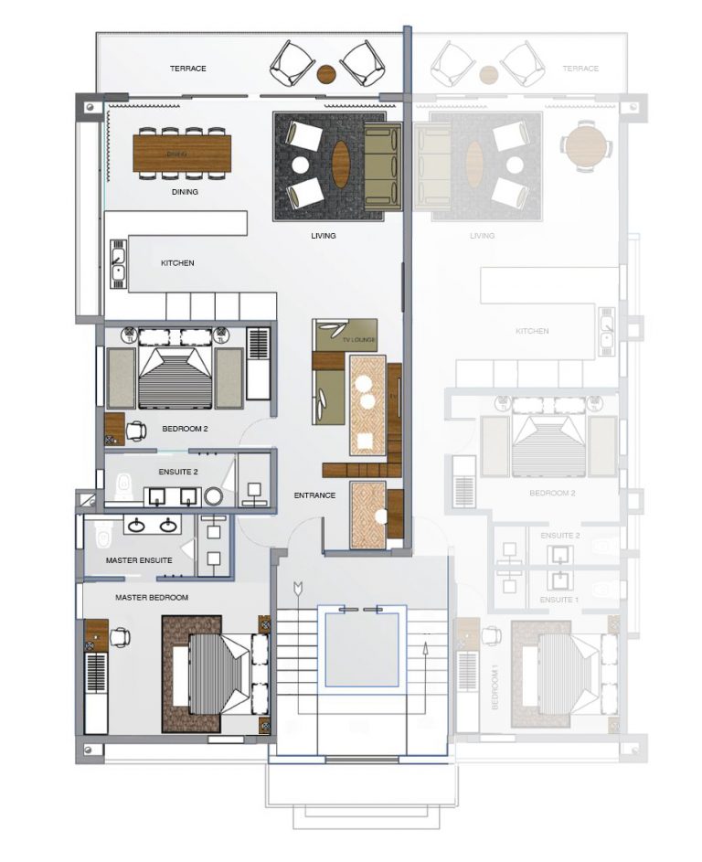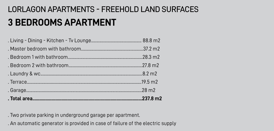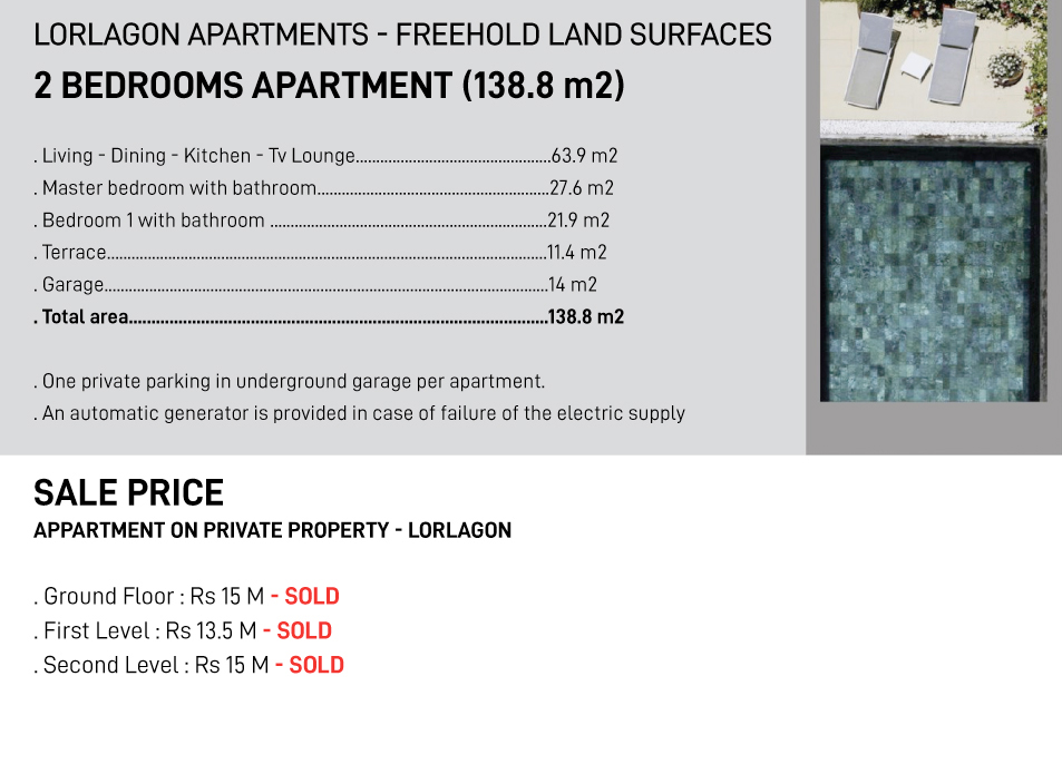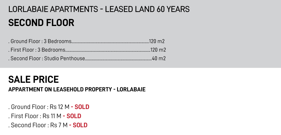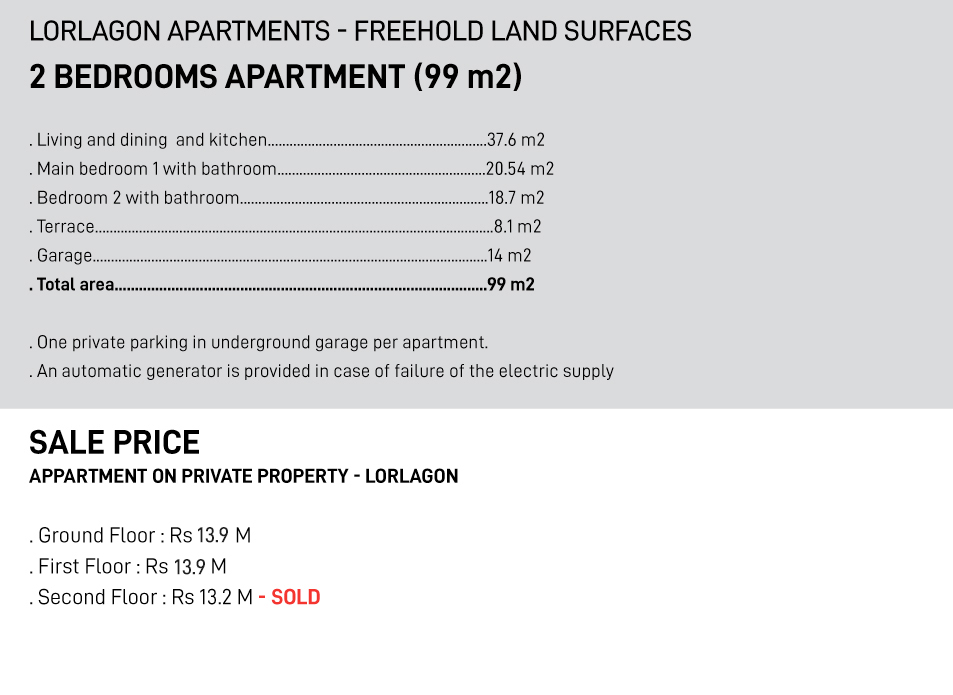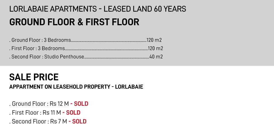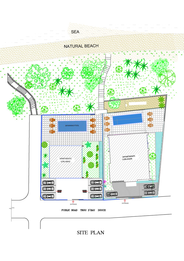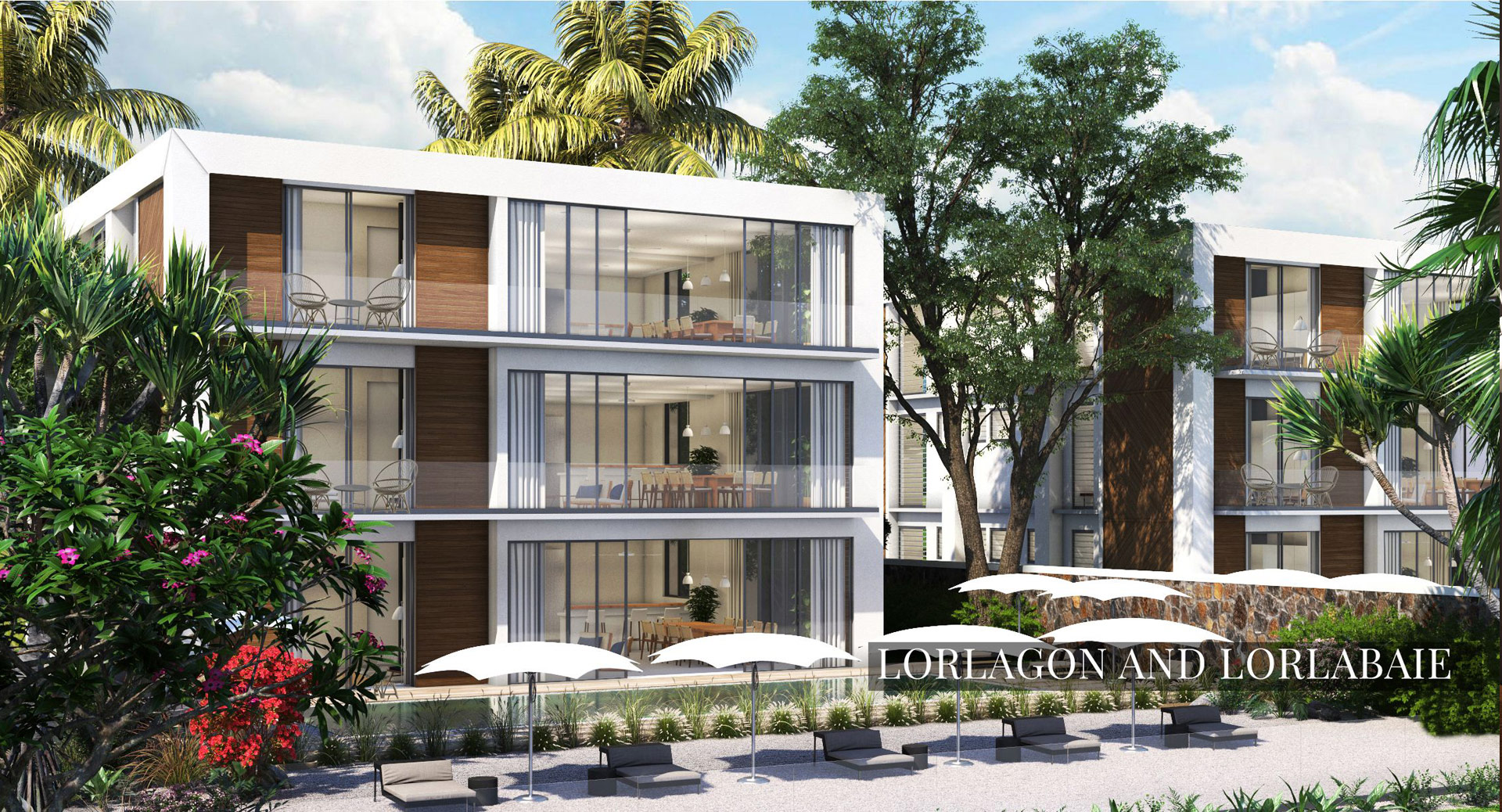 Luxury apartments of located in two separate buildings comprising of an underground parking for Lorlagon and outside covered parking for Lorlabaie, a ground floor plus two floors located in Trou D’Eau Douce, on the east coast of Mauritius.